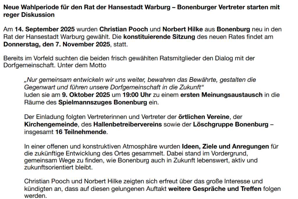 Neue Wahlperiode- Bonenburger Vertreter starten mit Diskussion